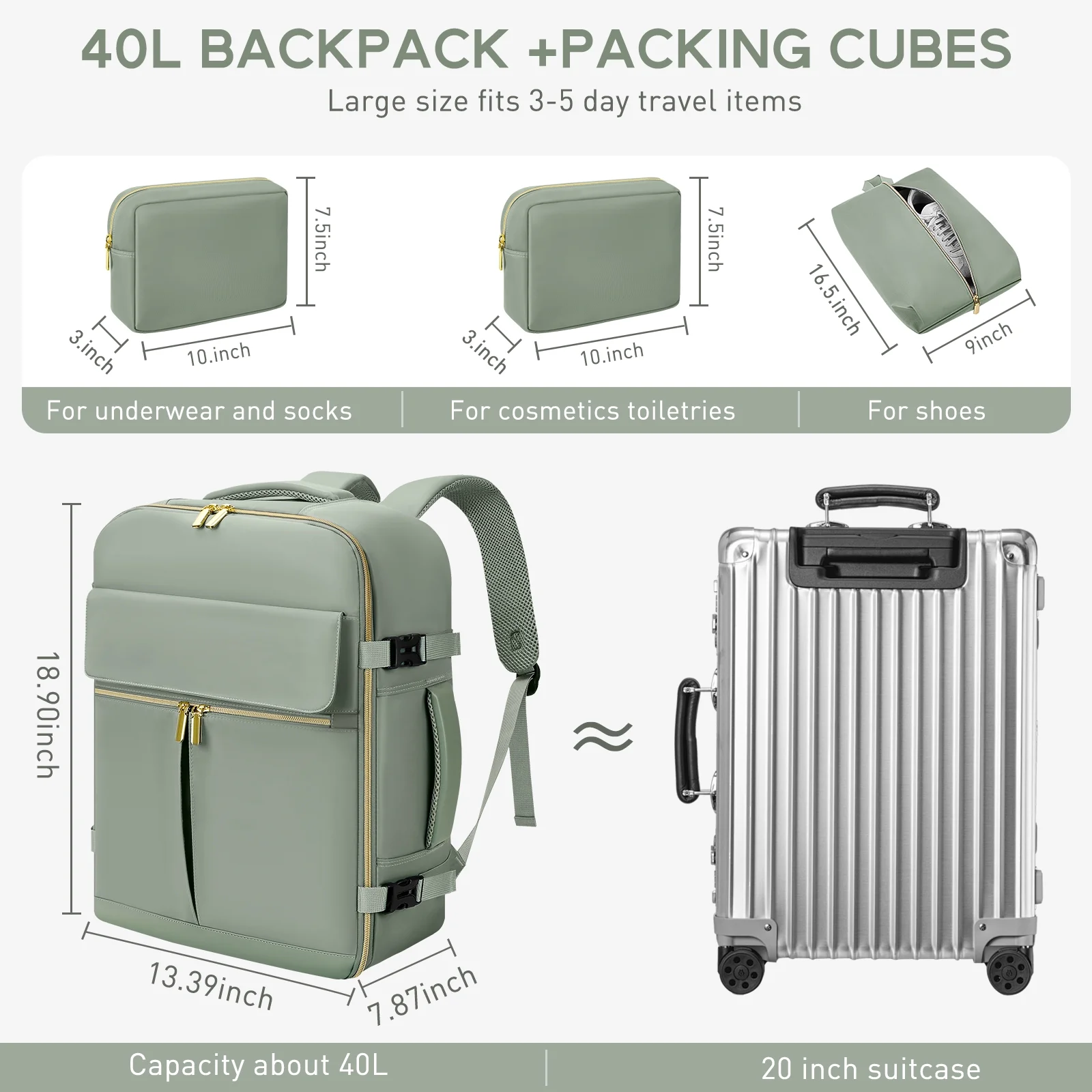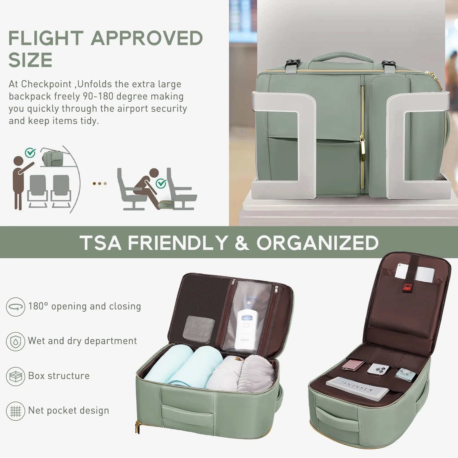 - ✈【Carry on Backpack Opens Like a Suitcase】180°opening design, fully opened zip closure, utilizing every inch of space. The carry on backpack for women has total of 3 compartments and 17 pockets, pack travel essentials for 3-7 days effortlessly. 40L backpack size: 18.5*14*8.5 inch, weight: 3.08 lbs.
